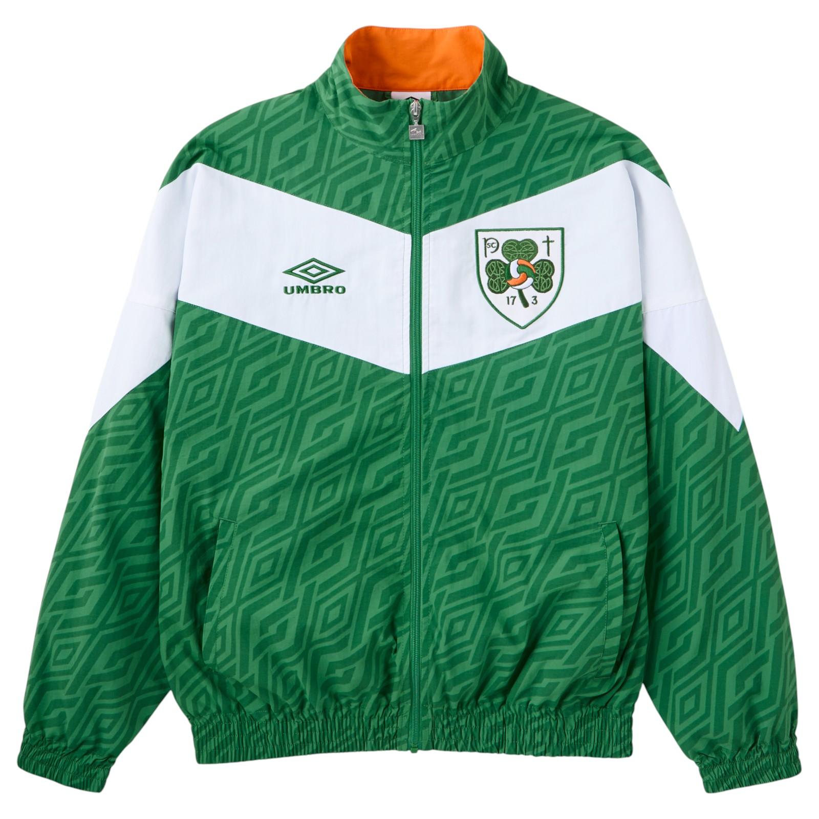 The 17-3 2026 Track Jacket’s relaxed and boxy fit echoes Umbro’s 1990s design playbook, and is emblazoned with the textured crest bearing Saint Patrick’s insignia.